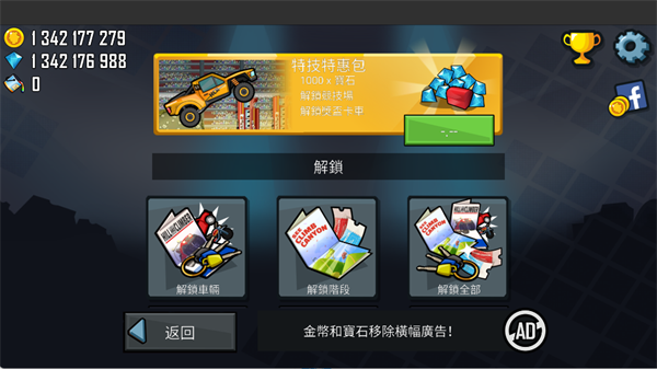 7、在游戲商店中,還可以用金幣或鉆石解鎖各種車輛地圖一鍵全部解鎖,讓你的車庫更多、更酷。