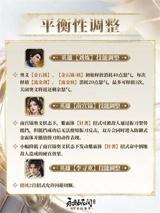 基于后臺數(shù)據(jù)與玩家反饋,S11賽季將對劉煉、南宮錦、李尋歡三位英雄進(jìn)行針對性調(diào)整,優(yōu)化技能強度與戰(zhàn)斗體驗,確保競技公平性。