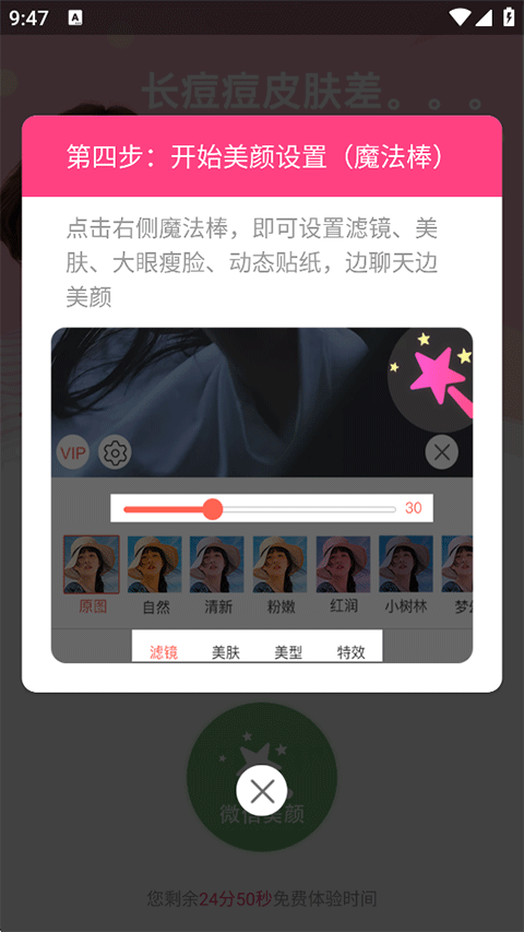 4. 在彈出面板中設(shè)置美顏強(qiáng)度、濾鏡風(fēng)格、美膚參數(shù)等,即可邊聊邊美;