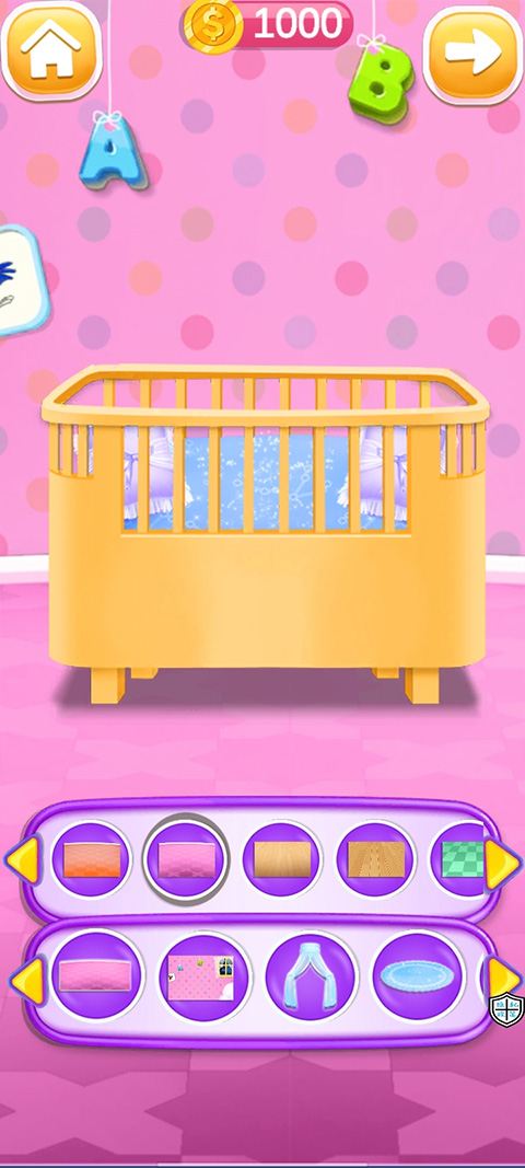1、在本站下載并安裝游戲后,打開應(yīng)用即可看到主界面。每個(gè)嬰兒用品圖標(biāo)代表一種玩法模式,左右滑動(dòng)可瀏覽不同選項(xiàng),例如選擇一個(gè)漂亮的嬰兒床開啟布置任務(wù)。