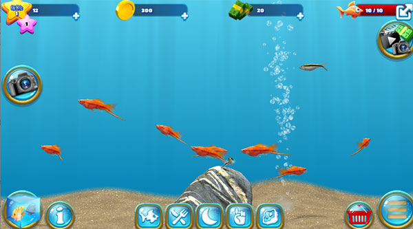 2、購買并放入魚缸后,可對魚兒進行喂食、互動,并查看其詳細信息與成長狀態(tài)。