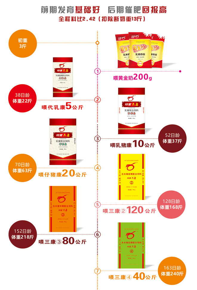 一頭乳豬從出生5天誘食,黃金奶搭配代乳康(黃金奶飼喂量200g/頭),代乳康累計采食量達5公斤,接著飼喂乳豬康10公斤后再飼喂仔豬康20公斤,豬只70日齡可達63斤,然后再飼喂三康②號120公斤(3包),三康③號80公斤(2包),三康④無抗飼料40公斤(1包),按模式喂完,豬只163日齡可達240斤。