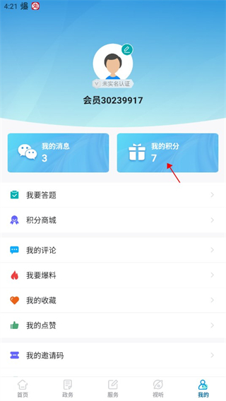 1. 進(jìn)入“我的”界面,點(diǎn)擊“積分”功能入口;