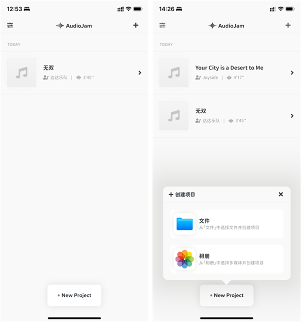 2. 打開應(yīng)用后,點(diǎn)擊右下角「+」號(hào)創(chuàng)建新項(xiàng)目,從本地文件中導(dǎo)入音頻(支持.mp3、.m4a、.aac、.aiff、.wav)或視頻(支持.mp4、.mov)。導(dǎo)入成功后,系統(tǒng)將自動(dòng)生成工程文件,并在播放界面顯示對(duì)應(yīng)波形圖。