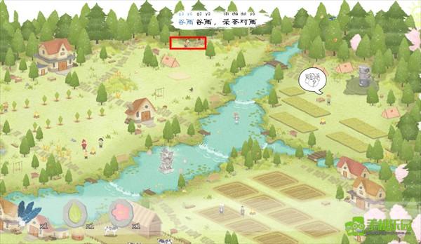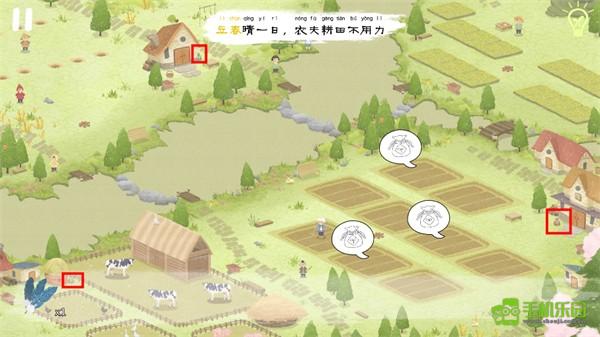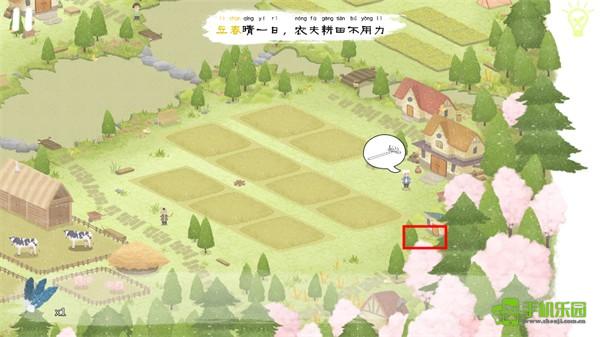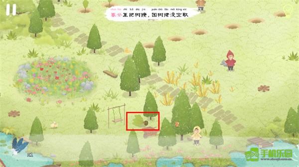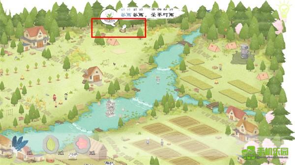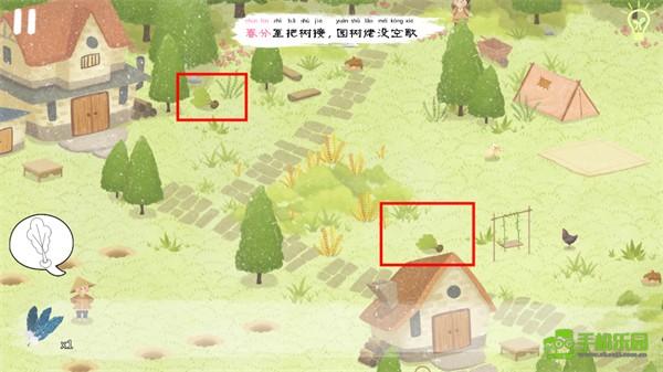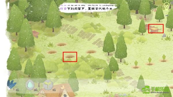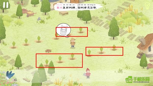 協(xié)助左上方農(nóng)民伯伯種樹。在場景三處位置找到【樹苗】(見下圖),拖動(dòng)至其身旁的三個(gè)紅框處栽種。