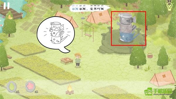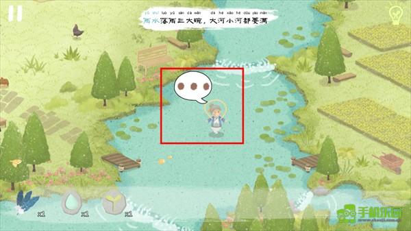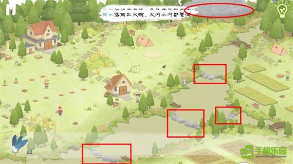 剛播下的種子急需灌溉,但小河仍干涸。根據(jù)“水源來自上游”的提示,前往右上角水源處,點(diǎn)擊橢圓形紅框內(nèi)的烏云,使其降下大雨。