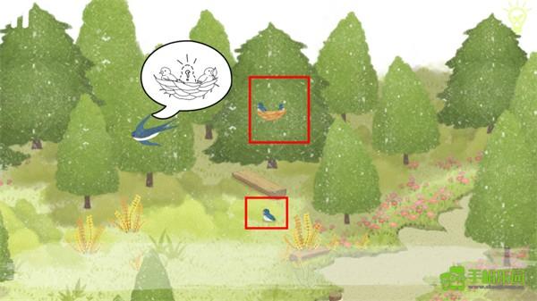 點(diǎn)擊地面紅框處的小燕子,隨后從左下角物品欄中拖動(dòng)“小燕子”交給紅框中的母燕,即可成功幫助燕子團(tuán)聚,并獲得【燕子羽毛】。
