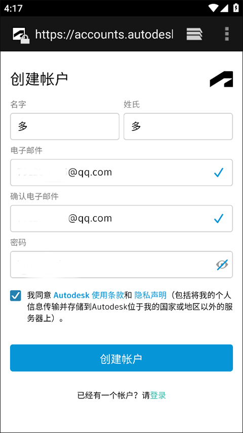 1. 在本站免費下載并安裝應(yīng)用,啟動后使用已有AutoCAD賬戶登錄,或通過填寫姓名、郵箱及密碼快速注冊新賬號。